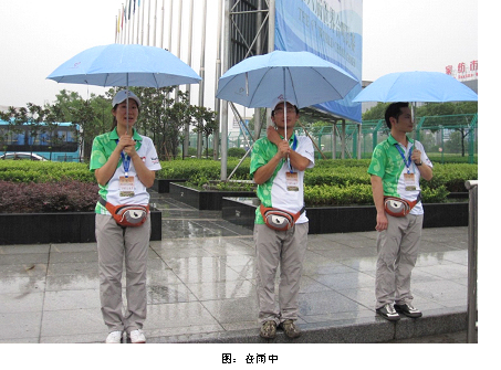 “伞,很多观众都没带,外面雨好大呀!”林队长焦急地喊道:“同志们,考验我们的时刻到了!”这时队员们二话没说,很快统一着雨披,手拿着伞,奔向雨中,给如常的观众撑伞。队员们不厌其烦的在大雨中往返于检票大门和场馆安检口之间,不知跑了多少个来回,直到把一个个观众安全地送进场馆……我们痛并快乐着!