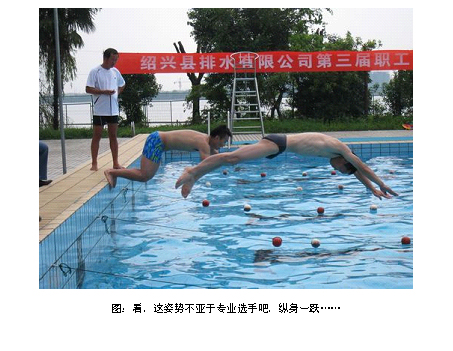 上午举行第三届职工游泳比赛,公司在柯桥南岸公园举行第三届职工游泳比赛。本次比赛项目分为男子个人50米、女子个人25米,此项水上运动公司已连续举办三年,深受职工欢迎,有近40名职工参加。比赛紧张有序,现场气氛活跃,精彩场面不断,加油声不绝于耳。